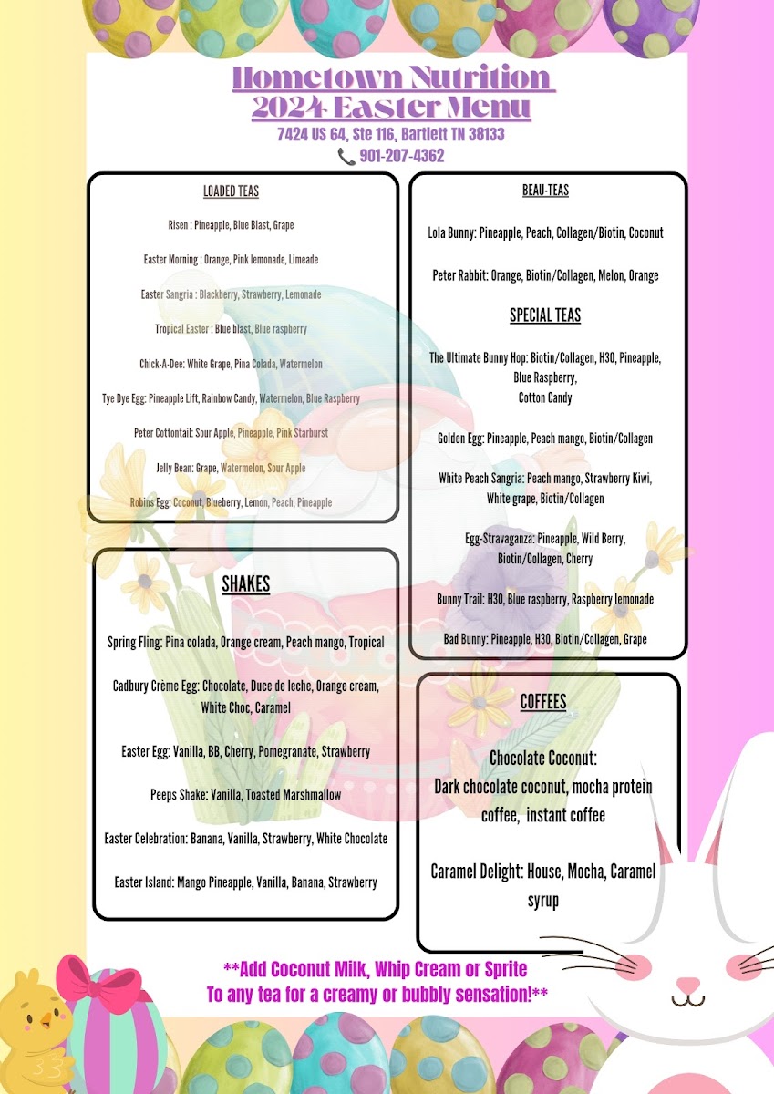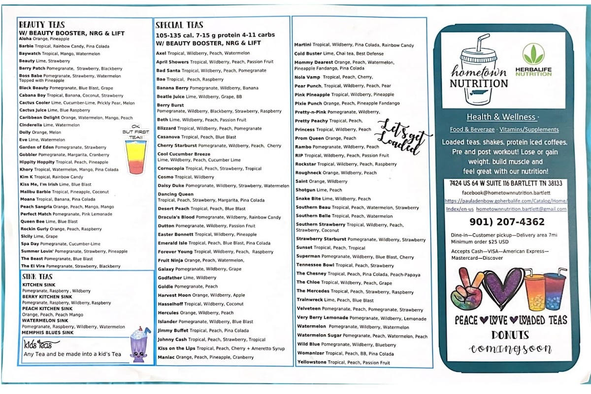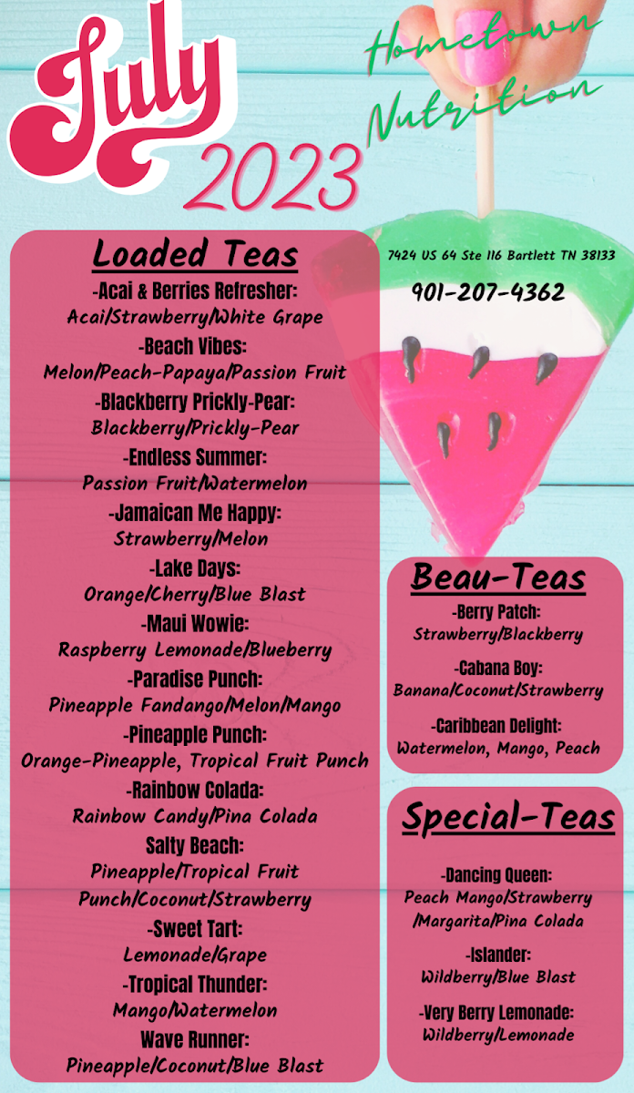 Hometown Nutrition in Bartlett, TN offers a refreshing and healthy menu, ideal for those looking for nutritious options without sacrificing flavor. Among the standout offerings, the Iced Tea is a crowd favorite, providing a crisp and rejuvenating beverage perfect for pairing with any meal. For those with a sweet tooth, the addition of Honey as a natural sweetener brings an extra touch of warmth and sweetness to drinks and dishes alike. The variety of options available ensures there’s something for everyone, from light snacks to more filling options. Whether you're stopping by for a quick refreshment or a wholesome bite, Hometown Nutrition's menu promises a delightful experience for health-conscious diners.